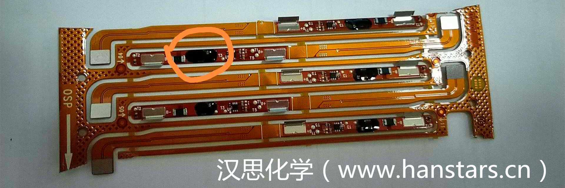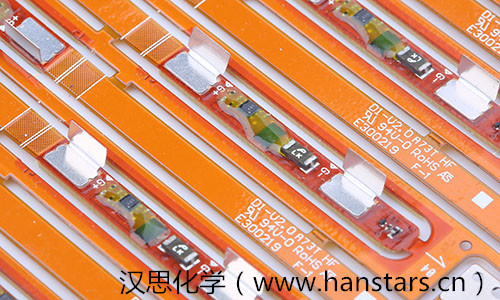 在手機電池保護板芯片底部填充及封裝應用方面,漢思化學研制的低粘度的底部填充膠,是一種單組份、快速固化的改性環氧膠粘劑,可靠性高、流動性大、快速填充、易返修,用于BGA、CSP和Flip chip底部填充制程,利用加熱固化形式,將BGA底部空隙大面積填滿(填充飽滿度達到95%以上),有效降低由于硅芯片與基板之間的總體溫度膨脹特性不匹配或外力造成的沖擊,提高芯片連接后的機械結構強度,增強BGA封裝模式芯片和PCBA間的抗跌落性能。